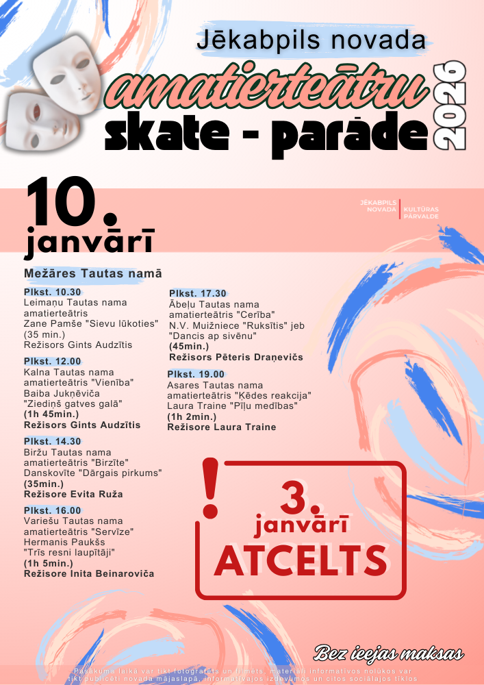 Janvāris Jēkabpils novadā būs piepildīts ar teātra burvību! Aicinām ikvienu uz amatierteātru skati–parādi, kur vairāku novada amatierteātru kolektīvi piedalīsies ar savām izrādēm
