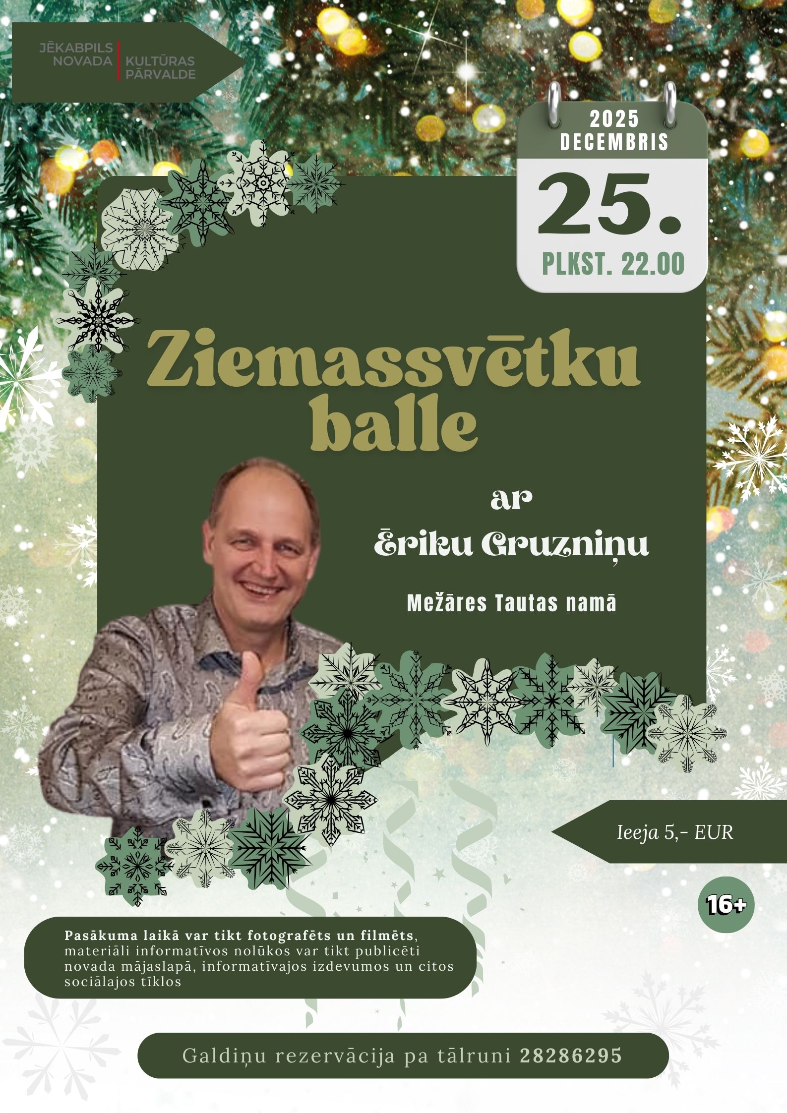 Ziemassvētku balle Mežārē 25.12.2025 - plkst.22.00 Mežāres Tautas nams 25.12. plkst. 22.00 Ziemassvētku balle ar Ēriku Gruzniņu Mežāres Tautas namā. Ieejas biļetes cena 5,00 EUR Atpakaļ
