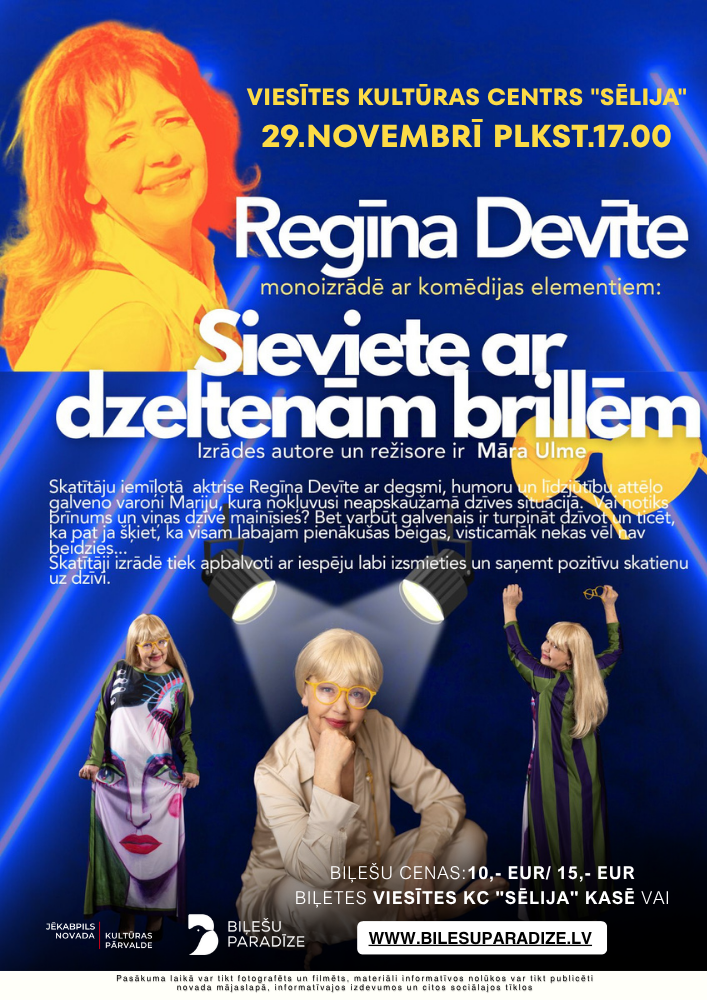 29.11. plkst.17.00 Viesītes kultūras centrā “Sēlija” viesosies REGĪNA DEVĪTE monoizrādē ar komēdijas elementiem “SEVIETE AR DZELTENĀM BRILLĒM”