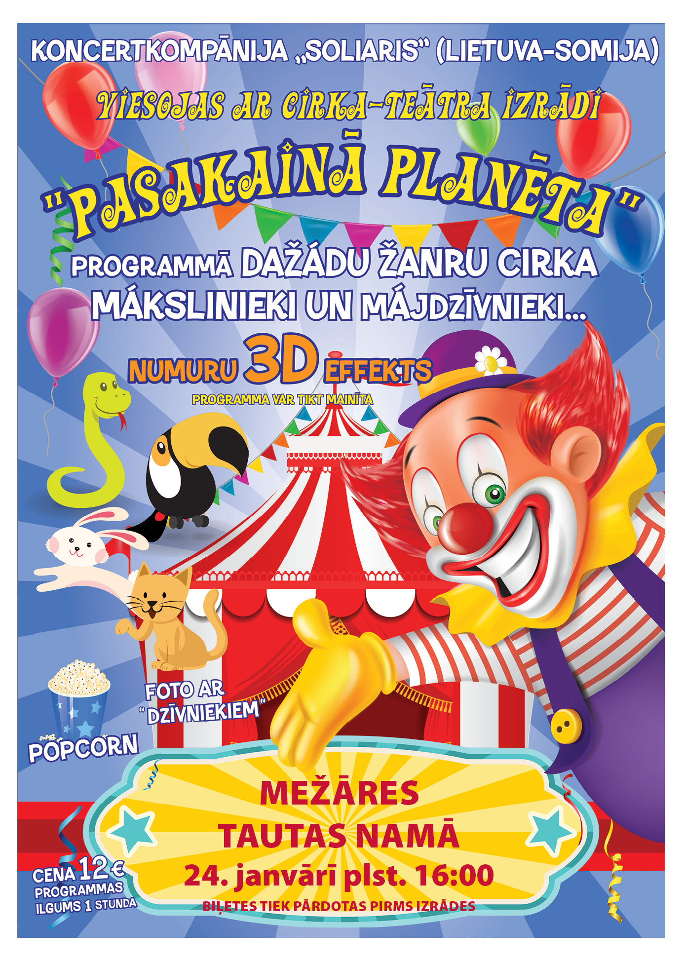 Koncertkompānija ”SOLIARIS” (Lietuva – Somija) viesojas ar cirka – teātra izrādi ”Pasakainā planēta”. Programmā dažādu žanru cirka mākslinieki un mājdzīvnieki. Numuru 3D efekts. Foto ar dzīvniekiem. Biļetes tiek pārdotas pirms izrādes.