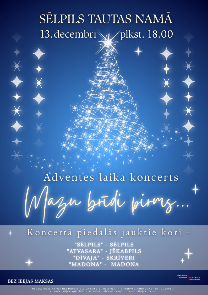 13. 12. plkst. 18.00 Sēlpils Tautas namā adventes laika koncerts “Mazu brīdi pirms…”.