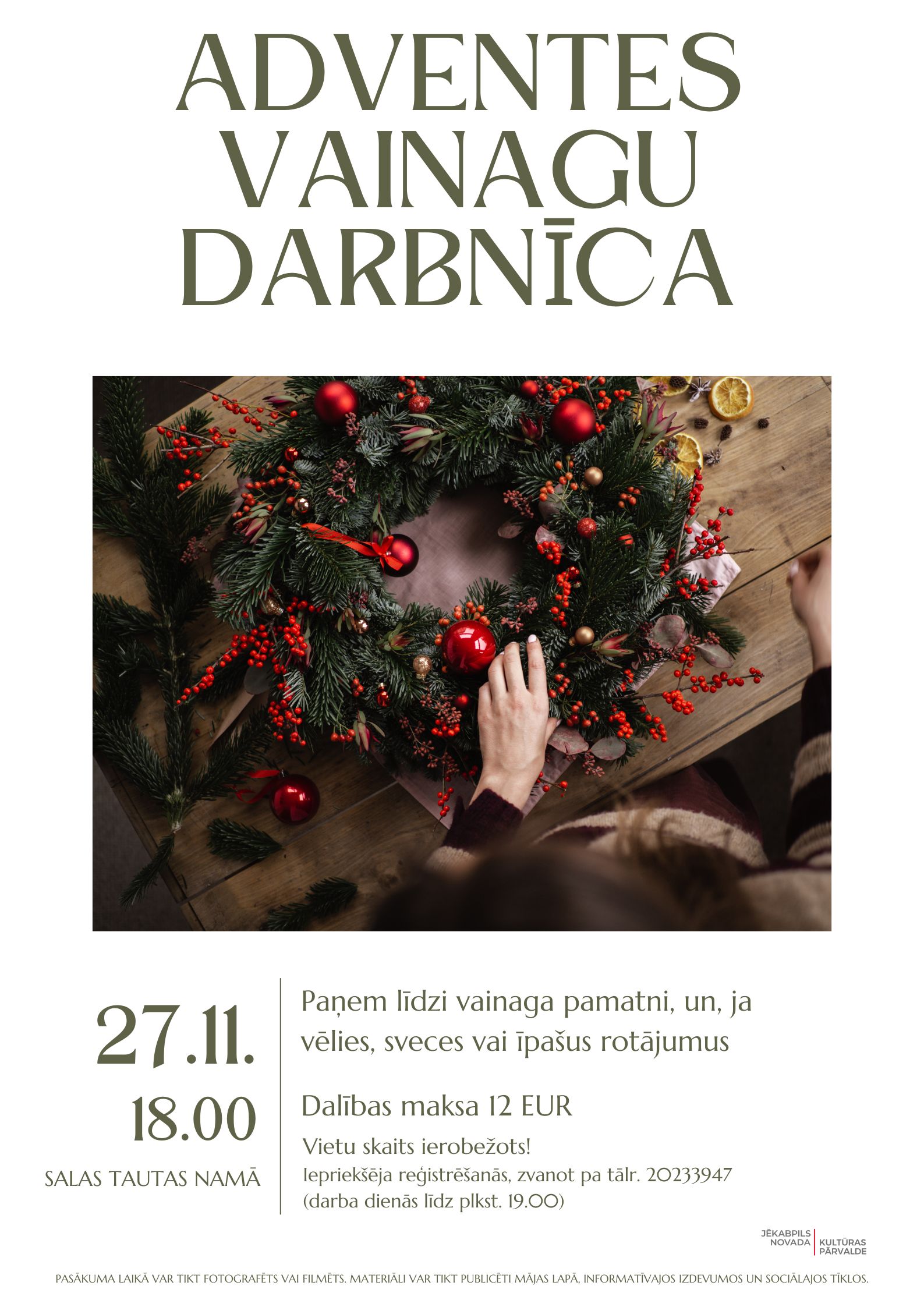 Īsu brīdi pirms pirmās Adventes, 27. novembra vakarā, plkst. 18.00, Salas Tautas namā aicinām uz tradicionālo Adventes vainagu darbnīcu, kurā ikviens ar dabas materiāliem un dažādiem dekoriem varēs izveidot savu īpašo svētku vainagu.