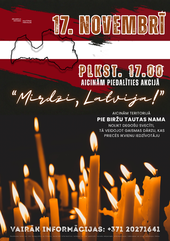 17.11. no plkst.17.00 aicinām piedalīties akcijā “Mirdzi, Latvija!”, teritorijā pie Biržu TN nolikt degošu svecīti, veidojot gaismas dārzu, kas priecēs ikvienu iedzīvotāju!