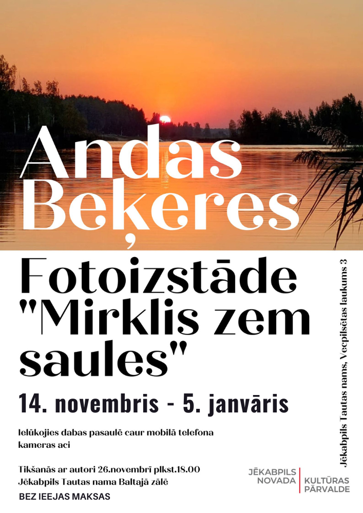No 14.11. līdz 5.01. Jēkabpils Tautas nama Baltajā zālē skatāma Andas Beķeres foto izstāde “Mirklis zem saules”.