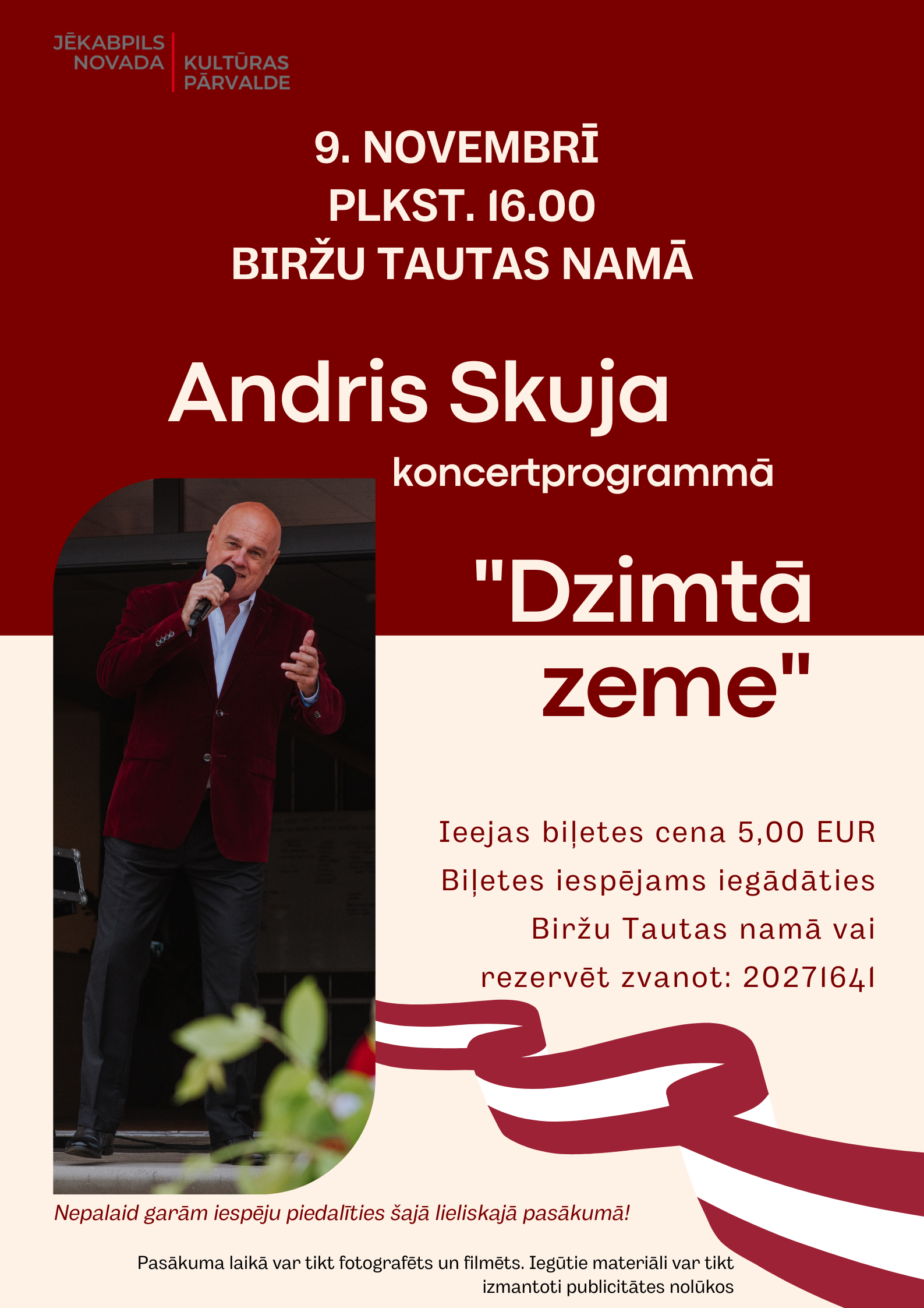 9.11. plkst. 16.00 Biržu Tautas namā notiks Andra Skujas koncerts “Dzimtā zeme”.