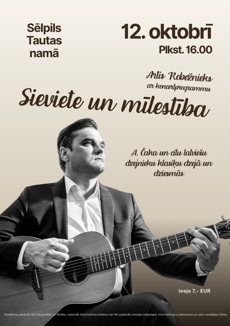 12.10. plkst. 16.00 Sēlpils Tautas namā dziedošais un harizmatiskais aktieris Artis Robežnieks koncertprogrammā “Sieviete un mīlestība A. Čaka un citu latviešu dzejnieku klasiķu dzejā un dziesmās”. Programmā latviešu mīlas lirika aktiera Arta Robežnieka izpildījumā, ar ģitāru ar vieglu smaidu un sentimentu.