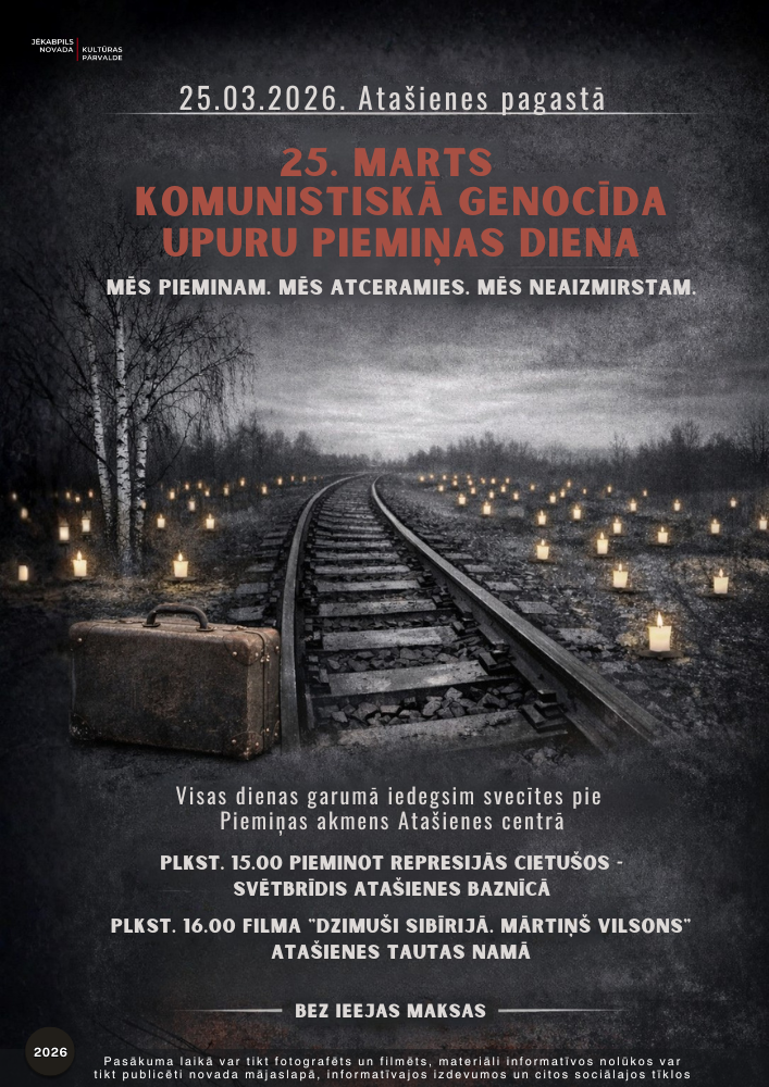 plkst. 16.00 Atašienes Tautas namā – Dzintras Gekas filma – “Sibīrijā dzimušie. Mārtiņš Vilsons” ļauj ieskatīties izsūtīto bērnu un viņu pēcteču likteņos – stāstos par piedzimšanu izsūtījumā, atgriešanos Latvijā un cīņu par identitāti svešā, ne reti atsvešinātā vidē. Caur personīgām intervijām un atklātām atmiņām atklājas ne tikai vēstures rētas, bet arī mantojums, kas dzīvo nākamajās paaudzēs. Tas ir stāsts par bērnību, kas sākas svešumā, par atgriešanos, kas neatnesa mieru, un par cilvēka spēku būt, neskatoties uz vēstures uzlikto nastu. Vienas dzimtas un visas tautas stāsts.