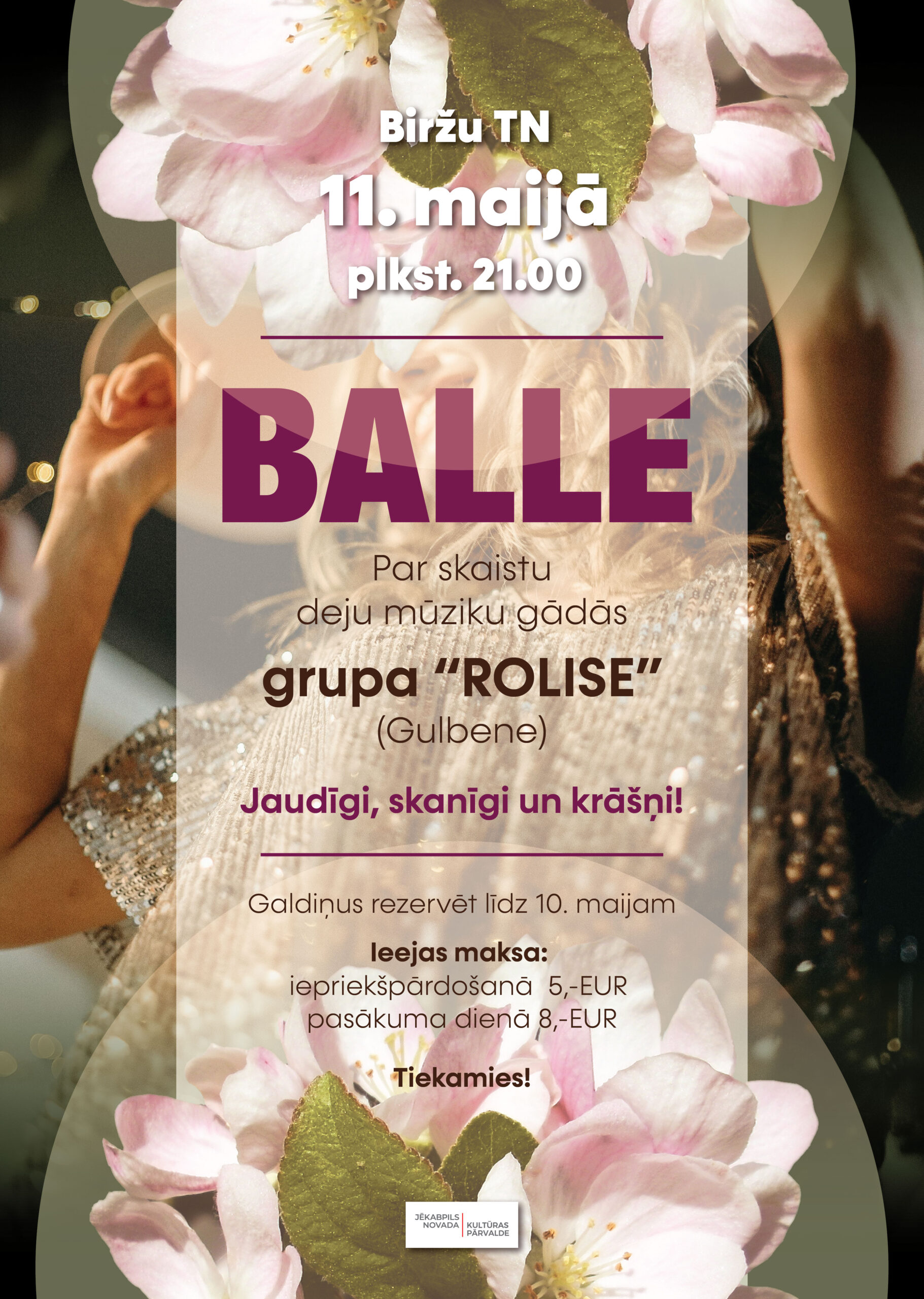 Balle ar grupu “Rolise” (Gulbene) 11.05.2024 - plkst.21.00 Biržu Tautas nams 11.05.plkst. 21.00 Balle! Par skaistu deju mūziku gādās grupa “Rolise” (Gulbene) Ieejas maksa: iepriekšpārdošanā 5,-EUR; pasākuma dienā 8,- EUR Galdiņu rezervācija līdz 10.maijam Atpakaļ