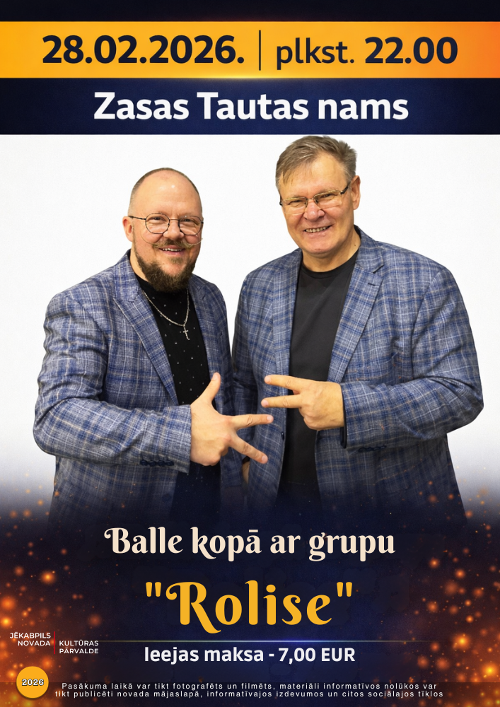 Balle kopā ar grupu “Rolise” 28.02.2026 - plkst.22.00 Zasas Tautas nams 28. februārī plkst. 22:00 Zasas Tautas namā balle kopā ar grupu “Rolise” Ieeja- 7.00 EUR Atpakaļ