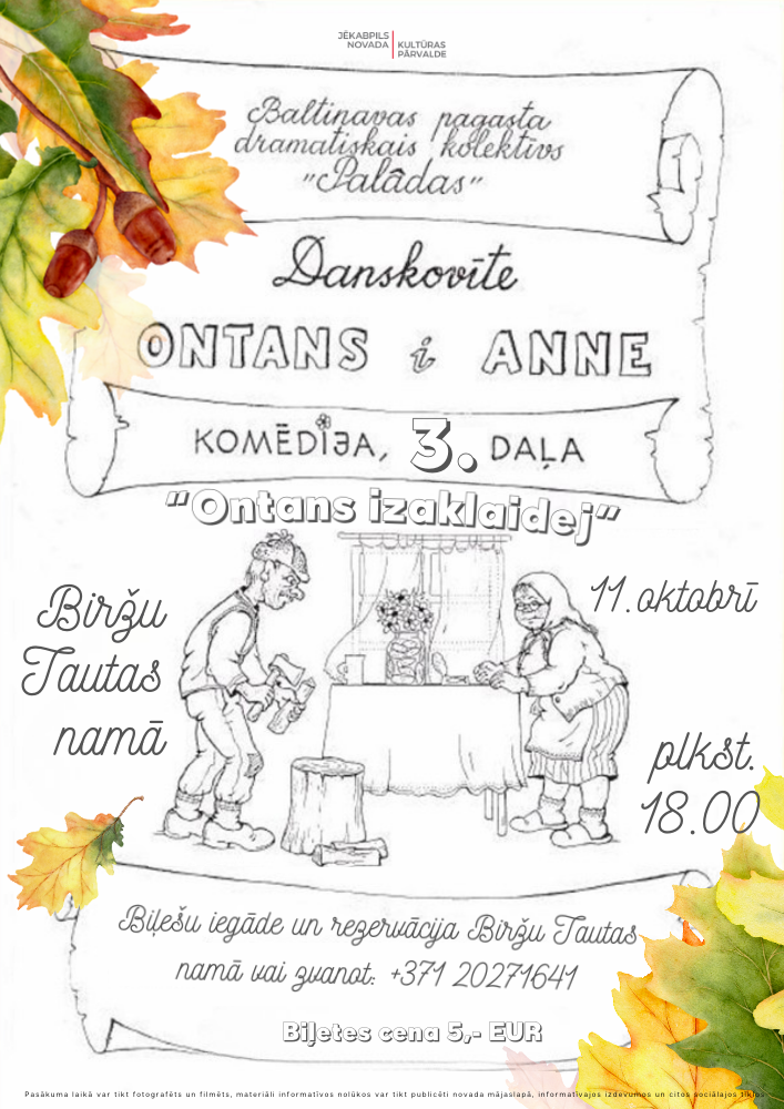 11.10. plkst.18.00 Biržu Tautas namā Baltinavas amatierteātra “Palādas”izrāde Danskovīte “Ontans i Anne ” 3 . daļa”Ontans izaklaidej”.