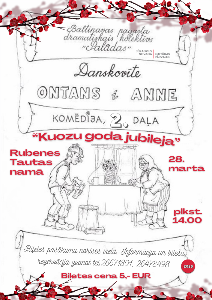28. martā plkst. 14.00 Rubenes Tautas namā Danskovītes izrāde – komēdija “Ontans i Anne” 2.daļa “Kuozu goda jubileja”