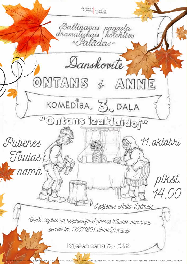 11.10. plkst.14.00 Rubenes Taututas namā viesosies Baltinavas pagasta dramatiskais kolektīvs “Palādas” ar Danskovītes izrādi-komēdiju “Ontans i Anne” 3.daļu “Ontans izaklajdej”.