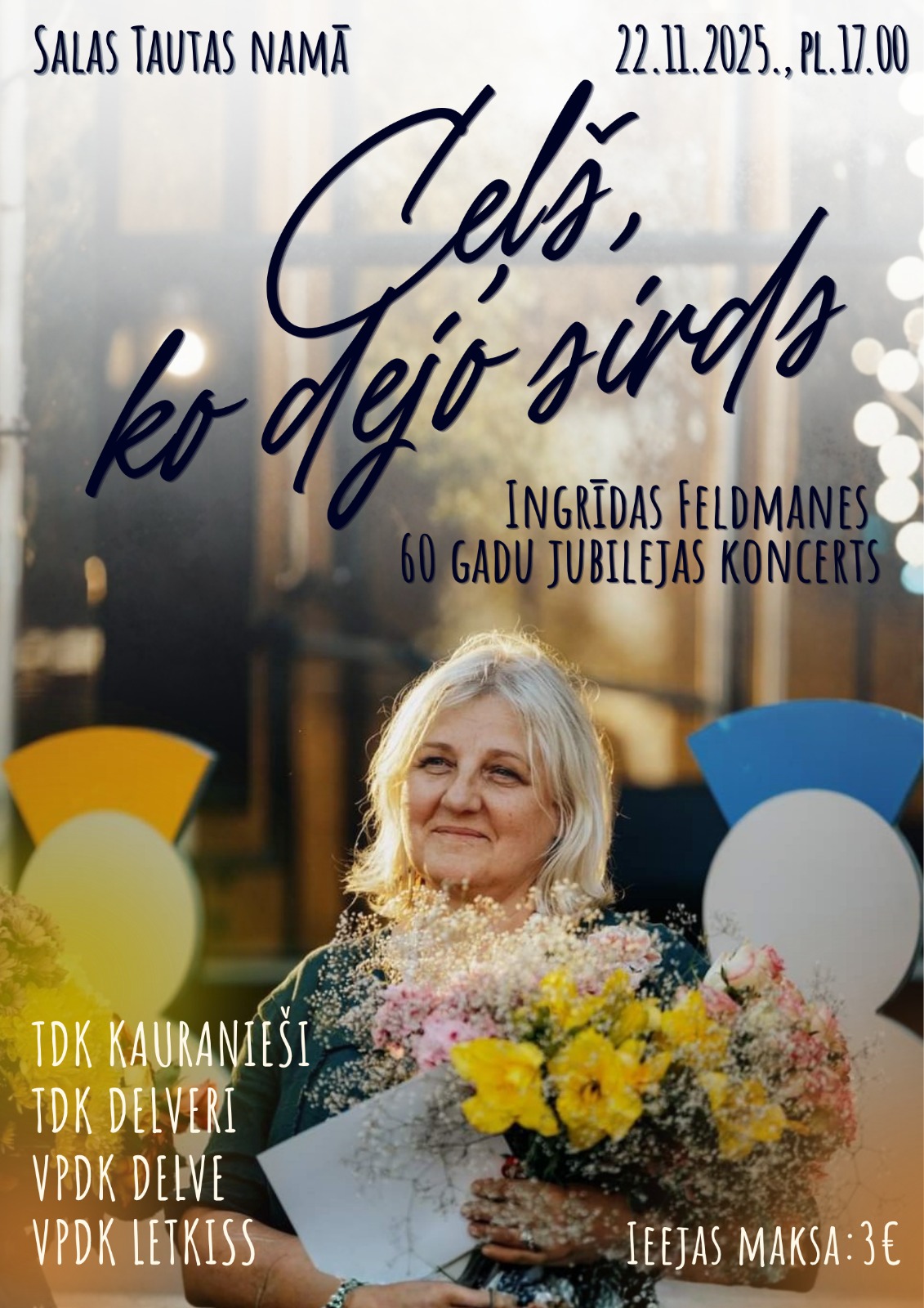22.11. plkst. 17.00 Salas Tautas namā notiks Ingrīdas Feldmanes jubilejas koncerts “Ceļš, ko dejo sirds”.