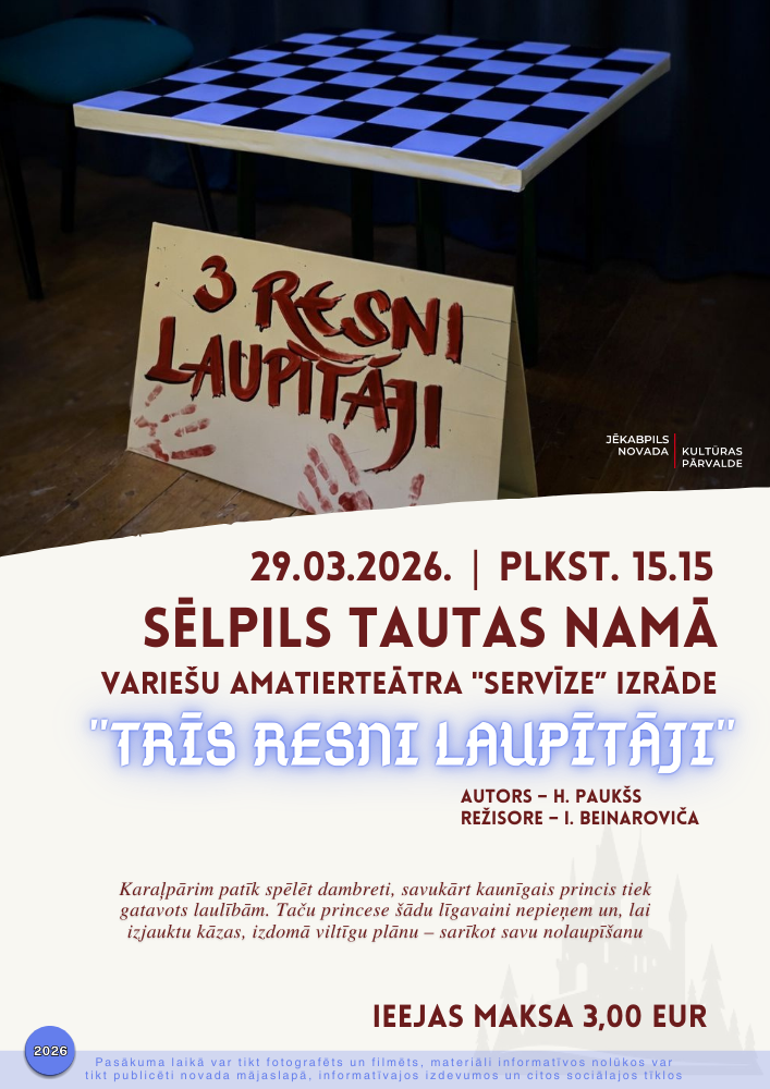 Plkst. 15:15 Variešu Tautas nama amatierteātris “Servīze” Hermanis Paukšs “Trīs resni laupītāji” režisore Inita Beinaroviča