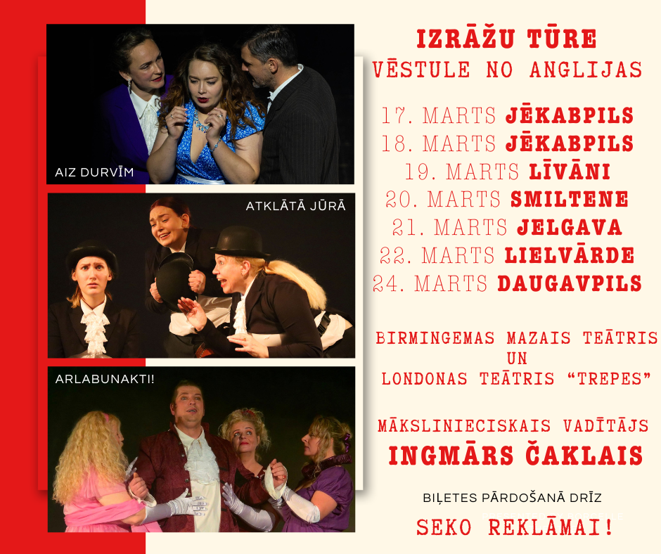 2026. gada martā Latvijas skatītājiem būs iespēja piedzīvot starptautisku teātra notikumu – izrāžu tūri“Vēstule no Anglijas”, ko piedāvāBirmingemas Mazais teātris un Londonas teātris “Trepes”. Tūres pamatā ir sadarbība starp Īrijā, Lielbritānijā un Latvijā dzīvojošajiem latviešu teātra profesionāļiem, kas apvienojuši radošos spēkus, lai Latvijā rādītu Londonā un Birmingemā tapušās izrādes. Tajās piedalās aktieri – amatieri, kuri jau vairākus gadus darbojas latviešu teātros ārpus Latvijas, savukārt izrādes top profesionāļu vadībā, veidojot vienotu radošu telpu starp dažādām valstīm un pieredzēm.