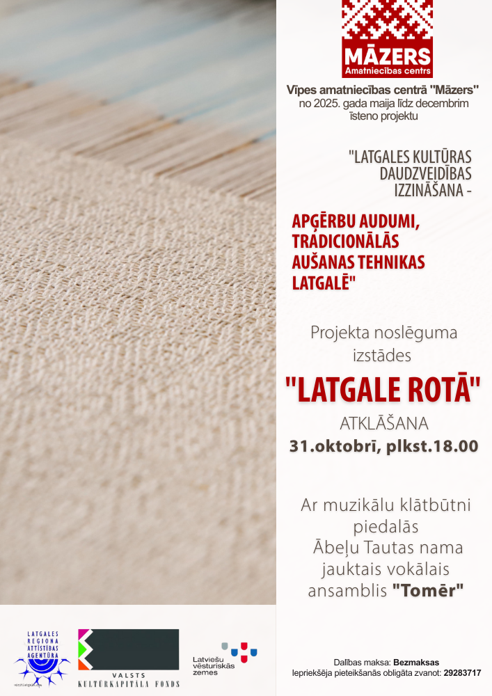 Šī būs “Latgales kultūras daudzveidības izzināšana – apģērbu audumi, tradicionālās aušanas tehnikas Latgalē” projekta noslēguma izstāde. Piedalās Ābeļu Tautas nama vokālais ansamblis “Tomēr”.
