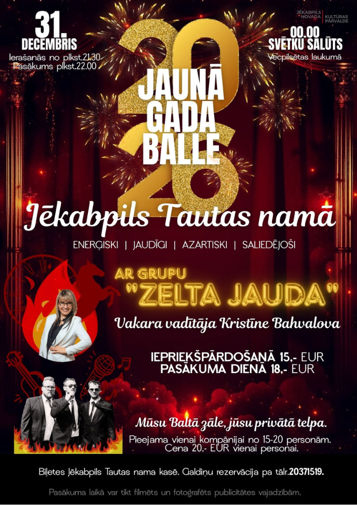 31.12. plkst. 22.00 Jaunā gada sagaidīšanas balle kopā ar grupu “ZELTA JAUDA”. Pasākumu vadītājs – Kristīne Bahvalova.