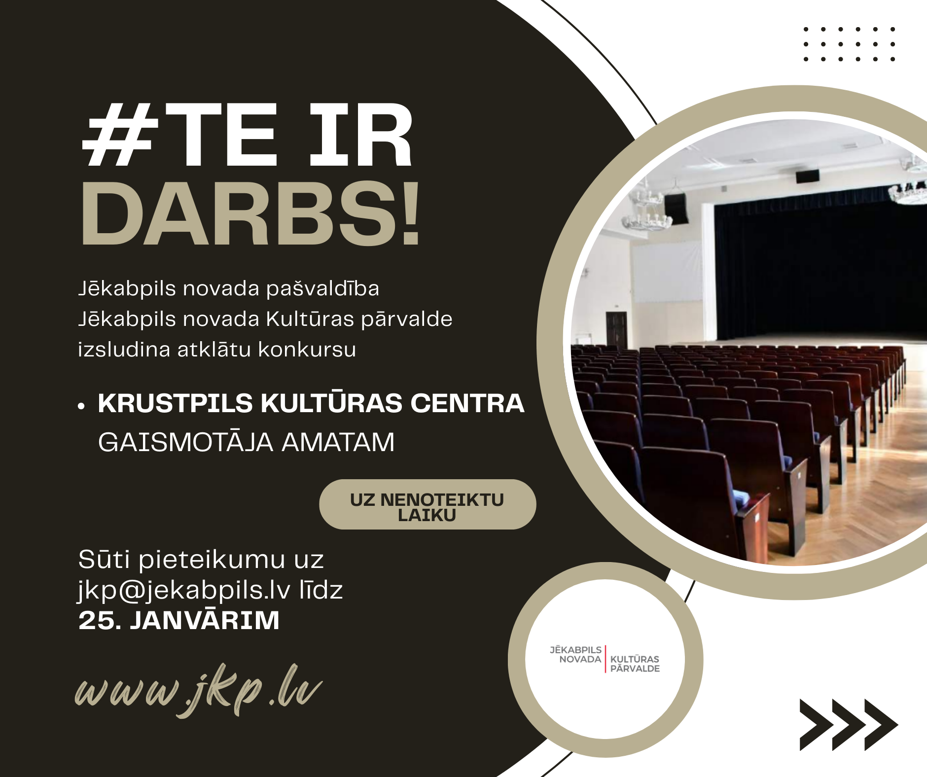 Jēkabpils novada Kultūras pārvalde izsludina atklātu konkursu Krustpils kultūras centra gaismotāja amatam (uz nenoteiktu laiku)
