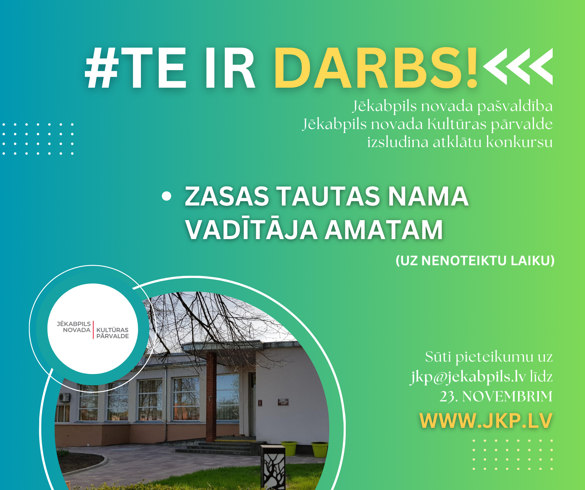 Jēkabpils novada Kultūras pārvalde izsludina atklātu konkursu Zasas Tautas nama vadītāja amatam uz nenoteiktu laiku