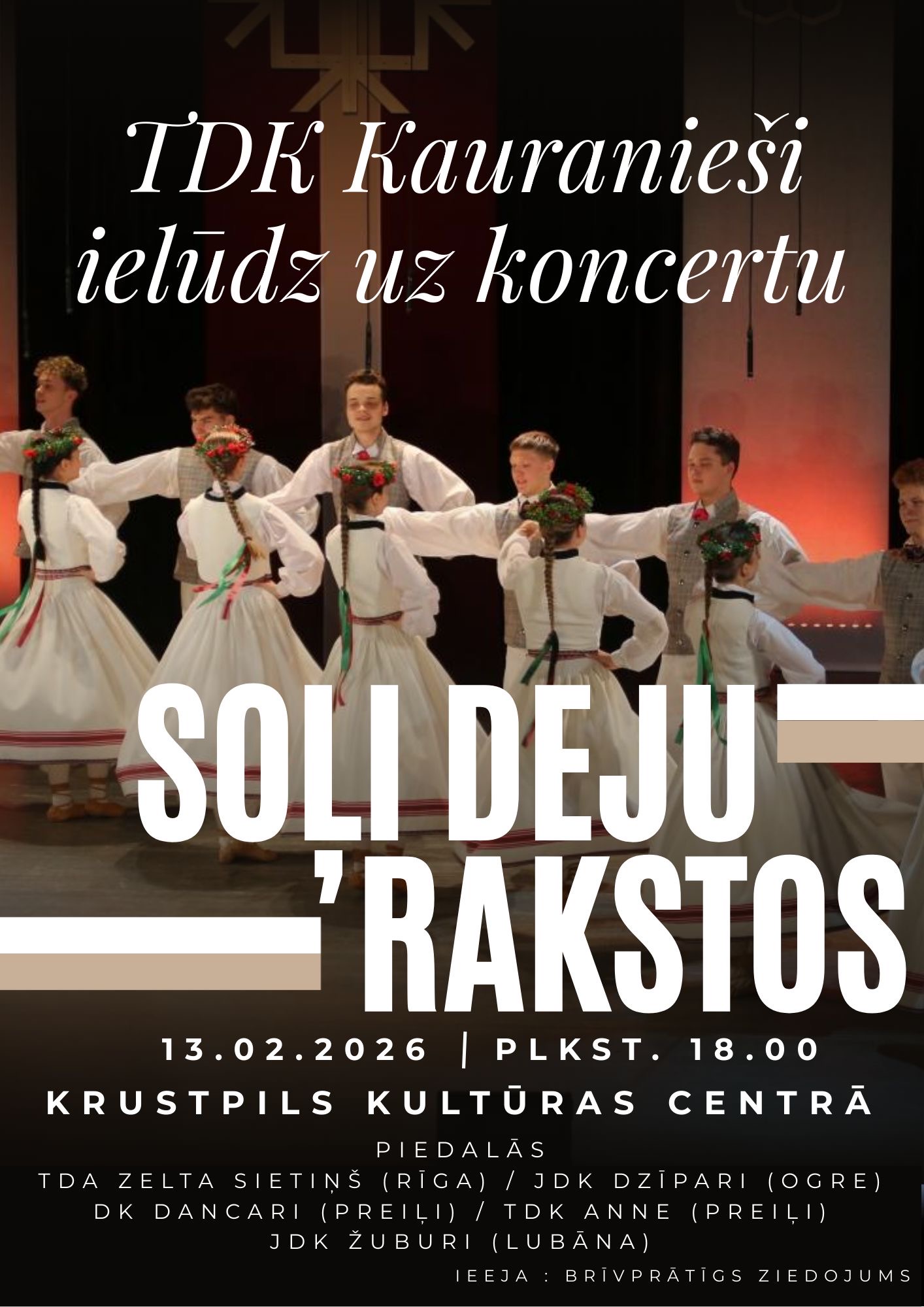 Šogad Jēkabpils Valsts ģimnāzijas deju kolektīvs “Kauranieši” svin savu 32. gadskārtu. Un kā jau tas notiek daudzu gadu garumā, savas dzimšanas dienas priekšvakarā, kolektīva vadītāja Ingrīda Feldmane, TDK “Kauranieši” kopā ar saviem deju draugiem TDA “Zelta sietiņš” (Rīga), JDK “Dzīpari”(Ogre), DK “Dancari”(Preiļi), TDK “Anne”(Preiļi) un JDK “Žuburi”(Lubāna), aicina draugus, ģimenes, atbalstītājus, kā arī pilsētas iedzīvotājus un viesus uz deju koncertu “Soļi deju rakstos”, 13. februārī plkst. 18.00.