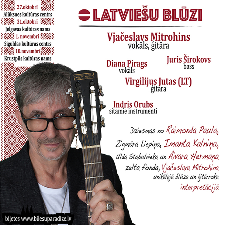 “Latviešu blūzi” ir unikāls veltījums Latvijas simtgadei, kurā izcilais ģitārists Vjačeslavs Mitrohins ar mīlestību atskaņo savu jaunāko programmu ‘’Latviešu blūzi’’ demonstrējot veiksmīgu cittautiešu integrācijas paraugu Latvijas sabiedrībā. Koncertā skan Raimonda Paula, Zigmāra Liepiņa, Ulda Stabulnieka, Vjačeslava Mitrohina un Aivara Hermaņa dziesmas blūza stilā. Kopā ar Mitrohinu muzicēs instrumentālā grupa MMBand, jaunā un talantīgā blūza izpildītāja Diāna Pīrāgs, kā arī koncerta īpašais viesis, ģitārists no Lietuvas Virgilius Jutas.