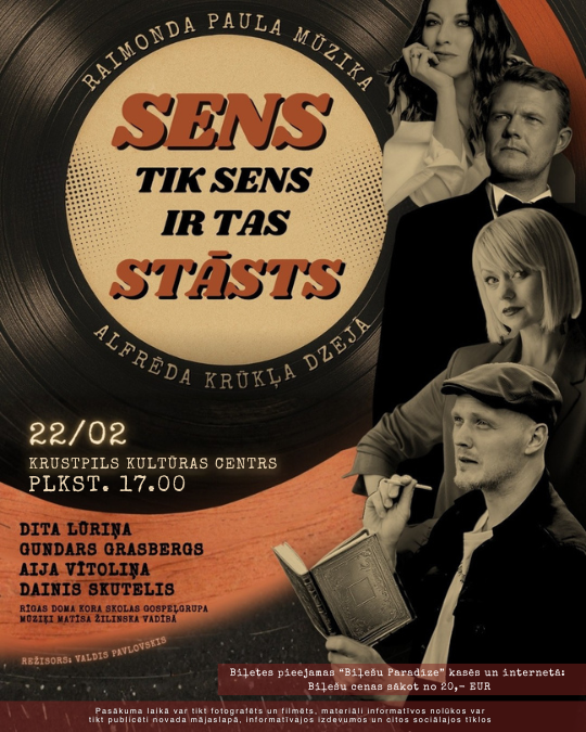 22.02. plkst. 17.00 Krustpils kultūras centrā notiks koncertuzvedums “SENS TIK SENS IR TAS STĀSTS”. Raimonda Paula mūzika Alfrēda Krūkļa dzejā.