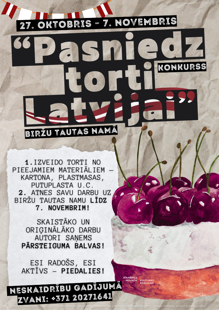 27.10.-7.11. Biržu Tautas nams aicina piedalīties konkursā “Pasniedz torti Latvijai!”.