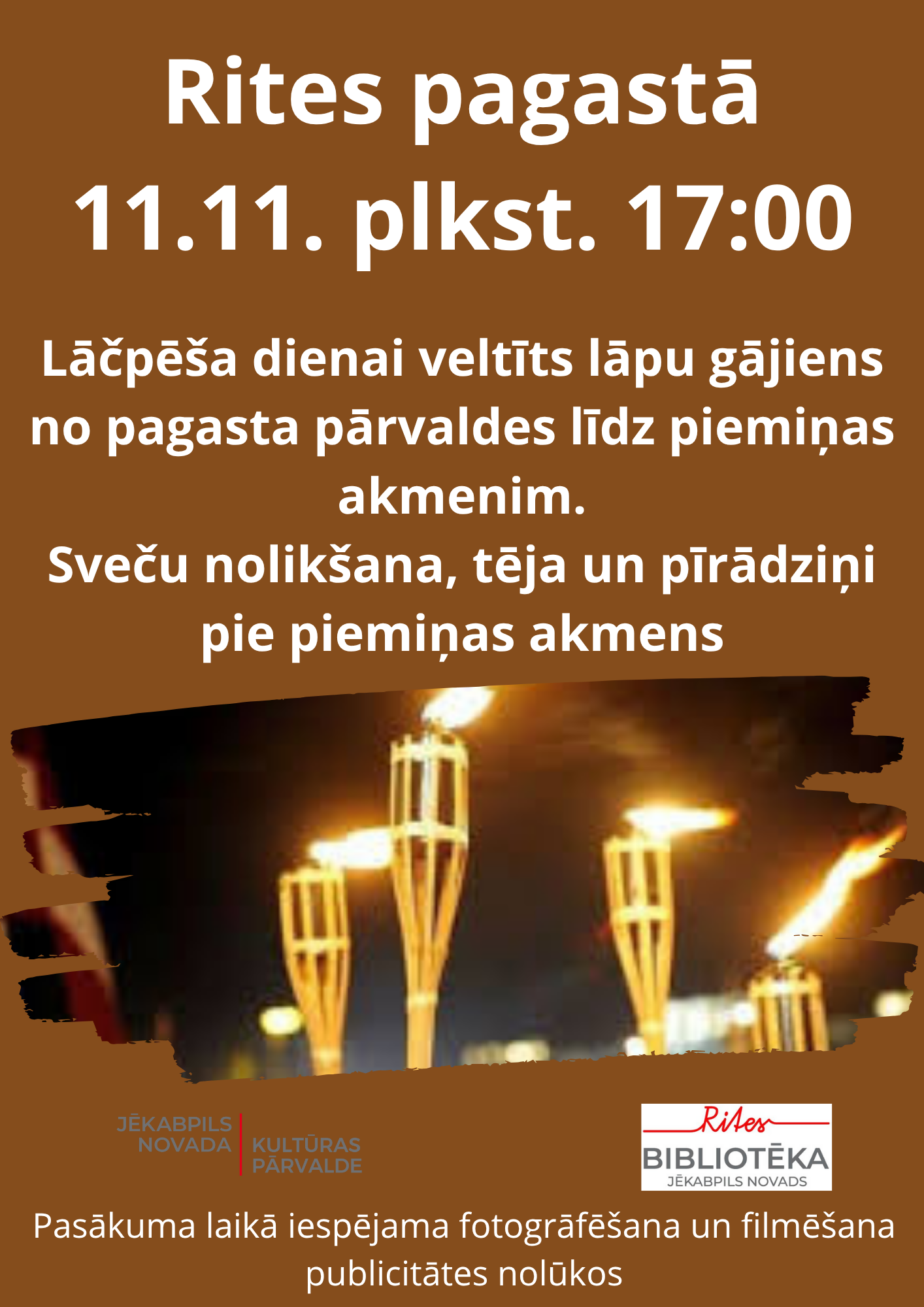 Lāčplēša dienas lāpu gājiens Ritē 11.11.2025 - plkst.17.00 Rites Tautas nams 11.11. plkst. 17.00 Lāčplēša dienas lāpu gājiens Ritē. Lāpu gājiens no pagastmājas līdz piemiņas akmenim. Pasākums tiek organizēts sadarbībā ar Rites bibliotēku, Atpakaļ
