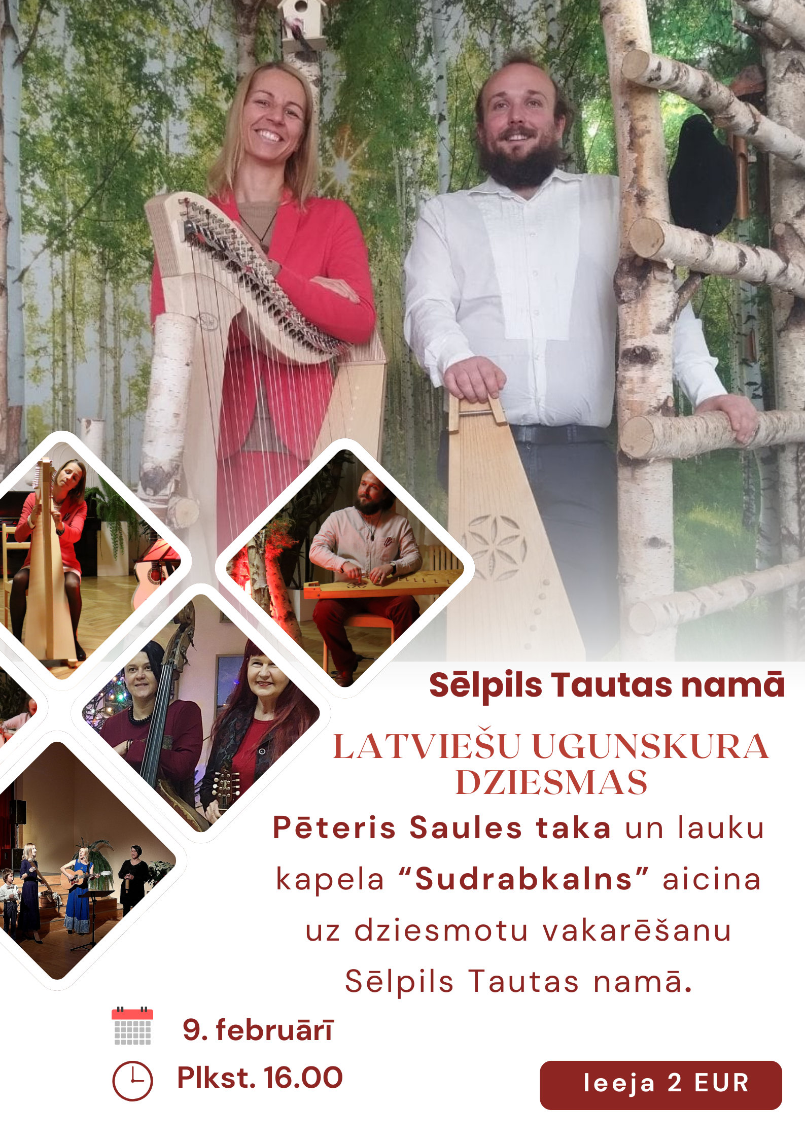 Latviešu ugunskura dziesmas 09.02.2025 - plkst.16.00 Sēlpils Tautas nams 9.02. plkst.16:00 Latviešu ugunskura dziesmas. Pēteris Saules taka un lauku kapela “Sudrabkalns” aicina uz dziesmotu vakarēšanu Sēlpils Tautas namā Ieejas maksa: 2,- EUR Atpakaļ