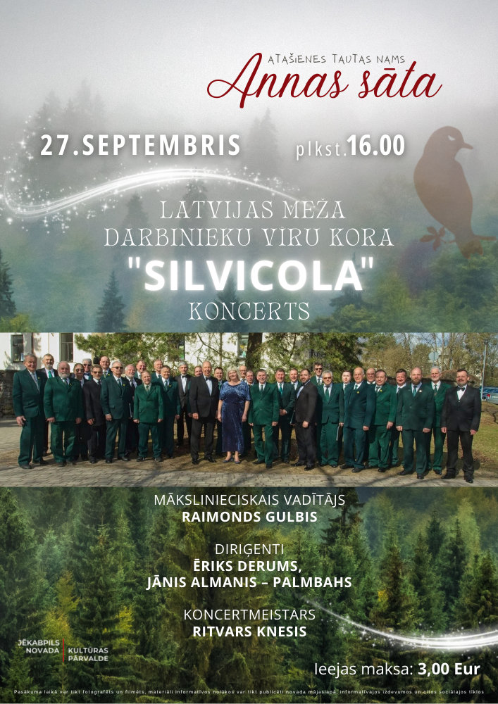 27. septembrī plkst. 16.00 Atašienes Tautas namā notiks Latvijas meža darbinieku vīru kora SILVICOLA koncerts.