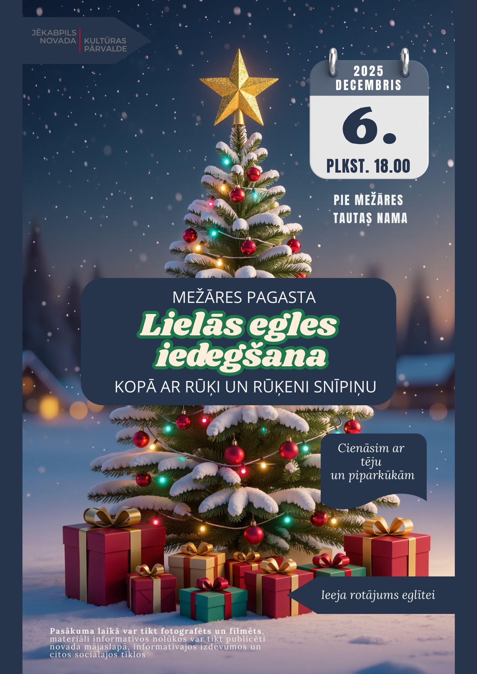 Lielās egles iedegšana Mežārē 06.12.2025 - plkst.18.00 Mežāres Tautas nams 06.12. plkst. 18.00 lielās egles iedegšanas pasākums Mežārē! Bez ieejas maksas Atpakaļ