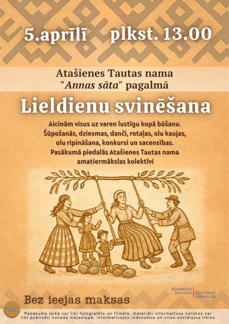 Lieldienās aicinām visus uz lustīgu kopā būšanu. Sūpošanos, dziesmam, dančiem, rotaļām, olu kaujām, olu ripināšanu, konkursiem un sacensībām. Pasākumā piedalās Atašienes Tautas nama “Annas sāta” amatiermākslas kolekīvi.