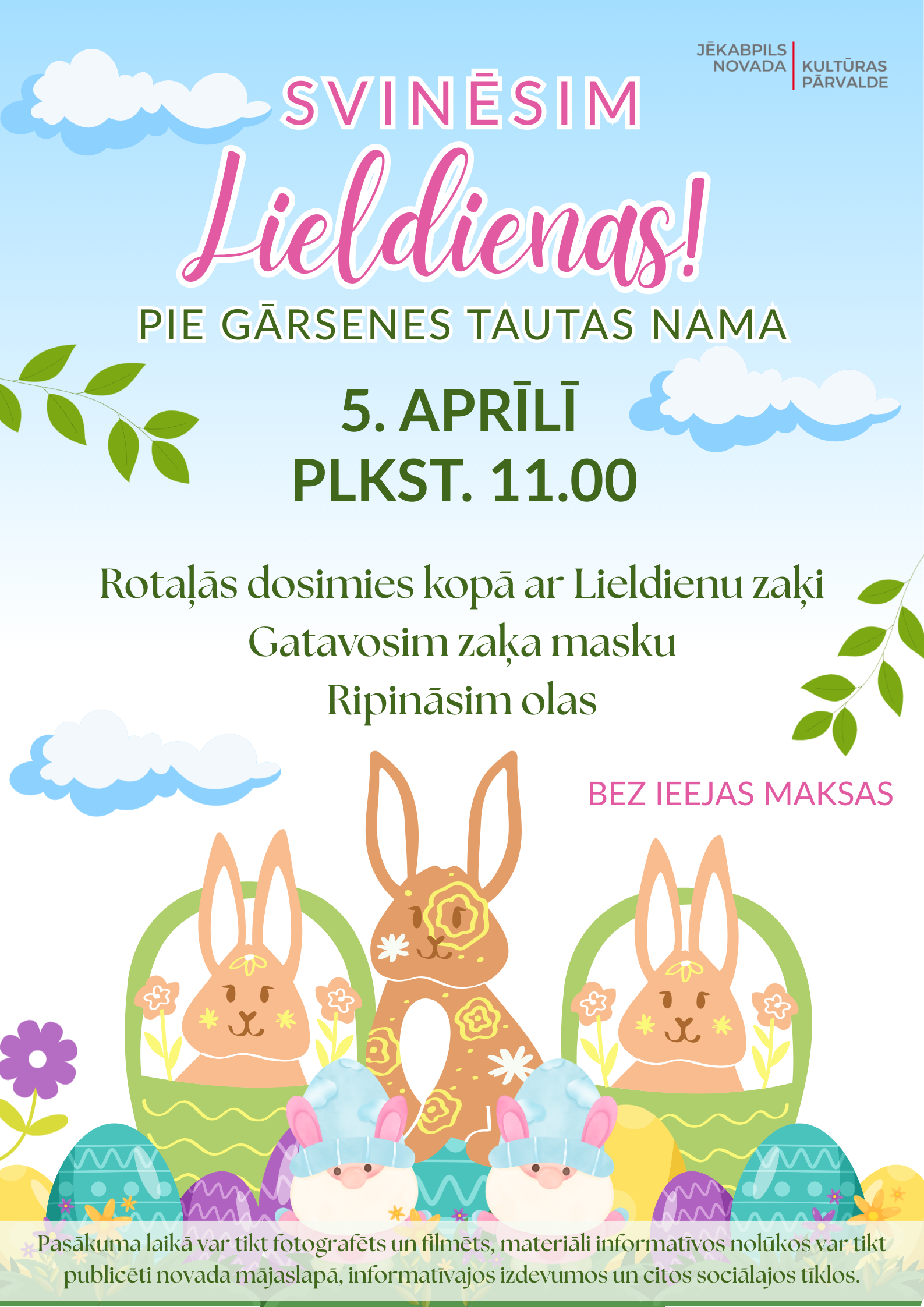 Aicināti gan lieli, gan mazi svētku svinētāji. Kopā mēs dosimies rotaļās ar Lieldienu zaķi, gatavosim zaķa masku, ripināsim olas!