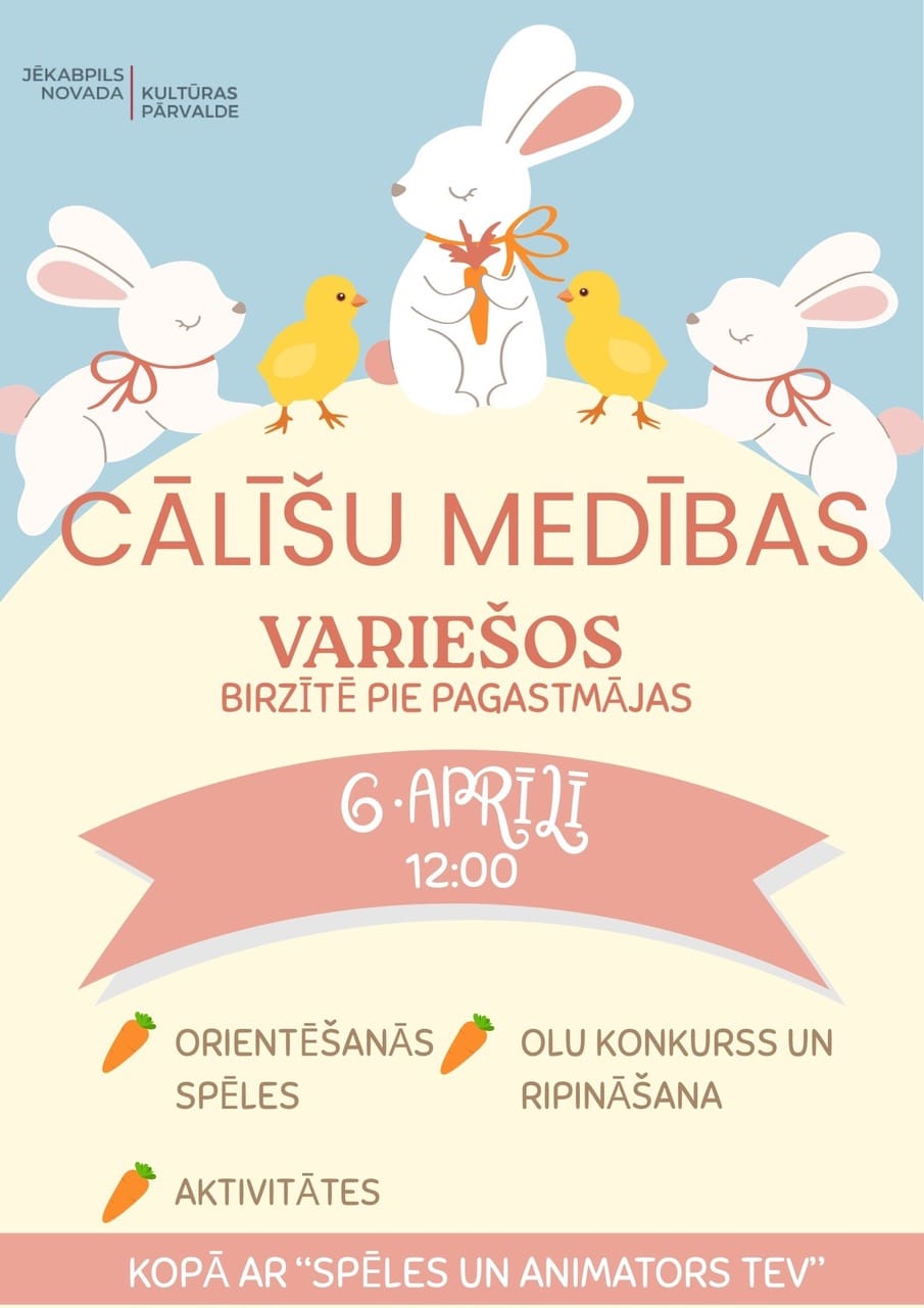 Lieldienu svinēšana kopā ar Lieldienu zaķi, rotaļas, spēles, olu ripināšana. Aicinām līdzi ņemt krāsainas Lieldienu olas!