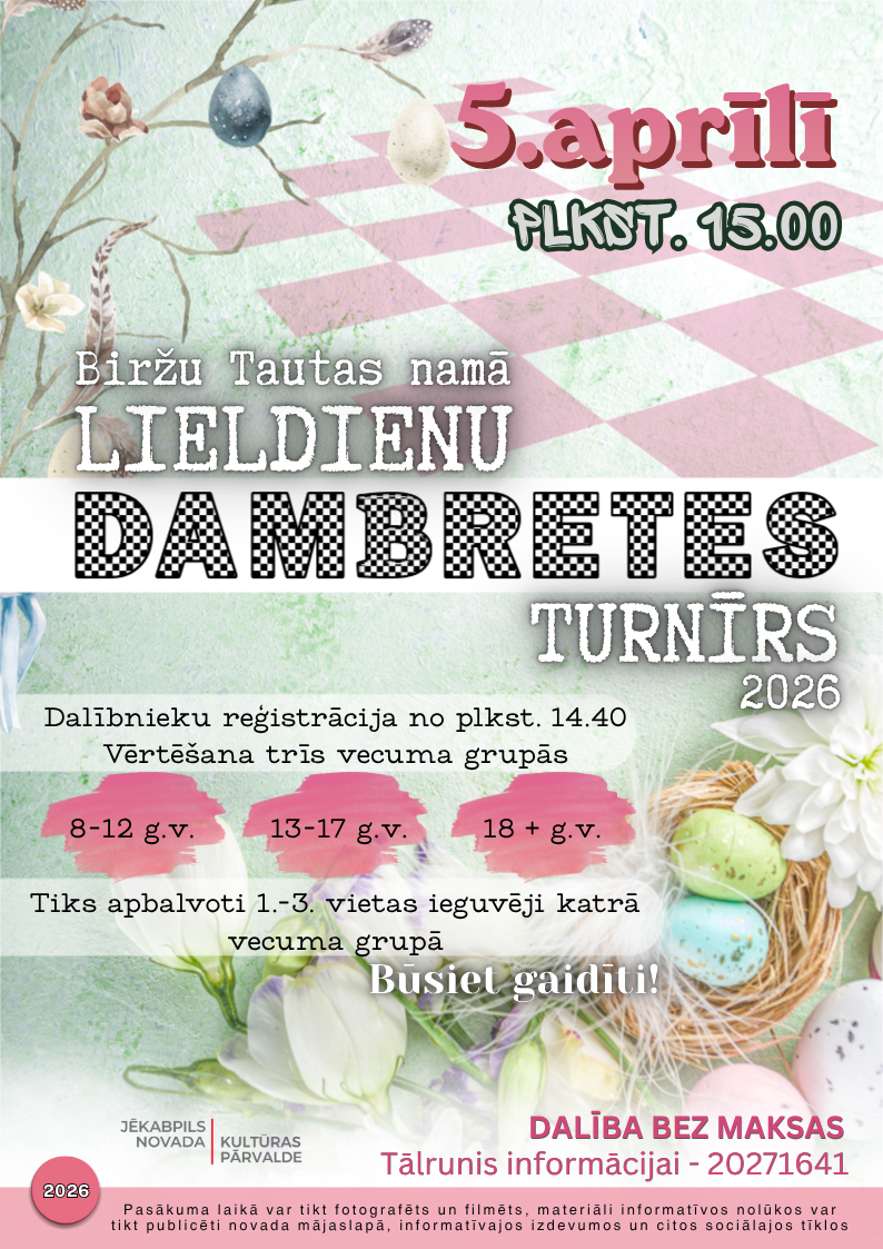 5. aprīlī plkst.15.00 Biržu Tautas namā Lieldienu dambretes turnīrs 2026