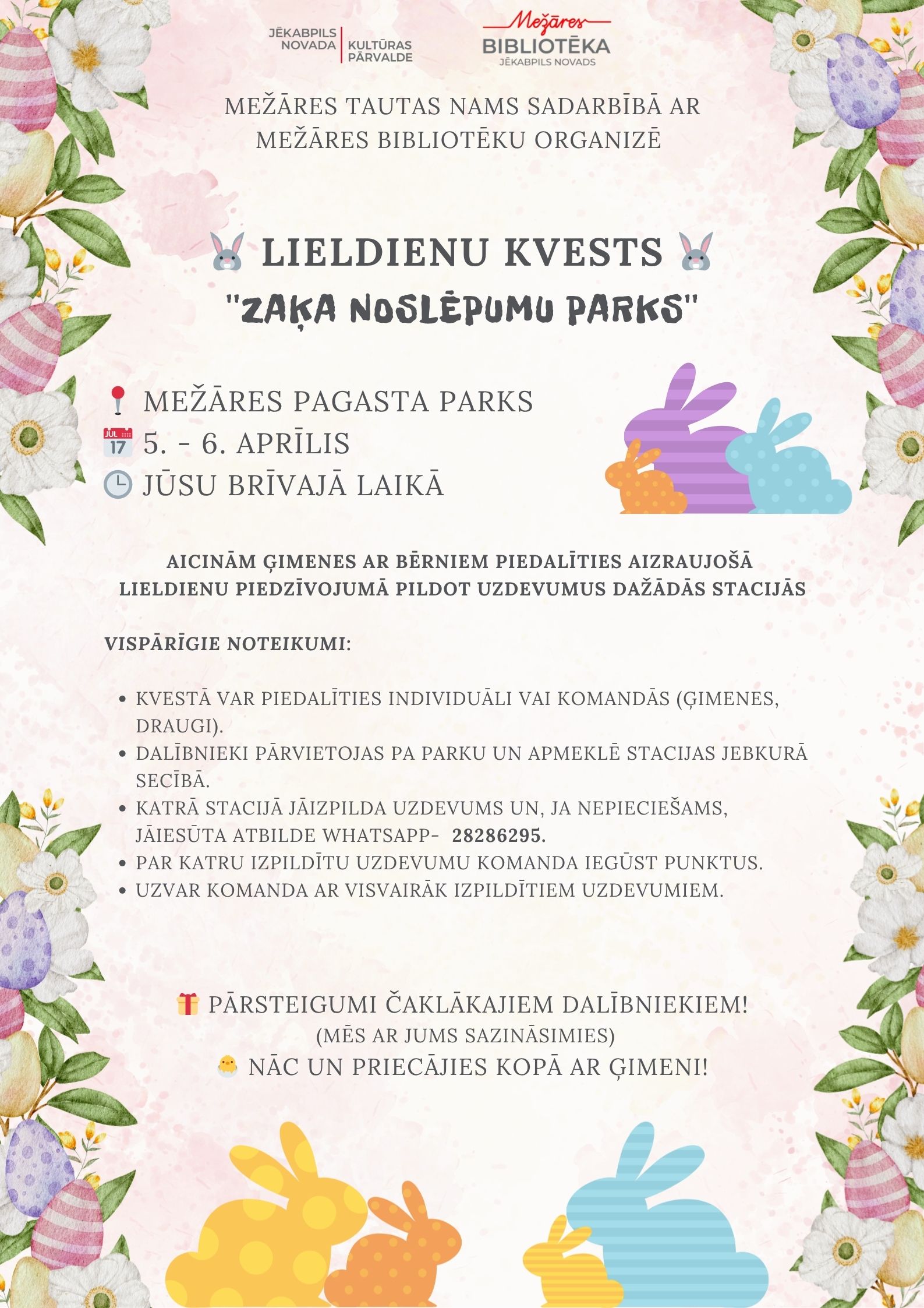 Pasākums notiks Mežāres pagasta parkā 5. – 6. aprīlī jūsu izvēlētajā laikā. Aicinām ģimenes ar bērniem piedalīties aizraujošā Lieldienu piedzīvojumā, pildot uzdevumus dažādās stacijās. Vispārīgie noteikumi: Kvestā var piedalīties individuāli vai komandās (ģimenes, draugi). Dalībnieki pārvietojas pa parku un apmeklē stacijas pašu izvēlētā secībā. Katrā stacijā jāizpilda uzdevums un, ja nepieciešams, iesūta atbildes WhatsApp uz telefona numuru 28286295. Par katru izpildītu uzdevumu komanda iegūst punktus. Uzvar komanda ar visvairāk izpildītiem uzdevumiem. “Pārsteigumi čaklākajiem dalībniekiem! (Mēs ar jums sazināsimies)”