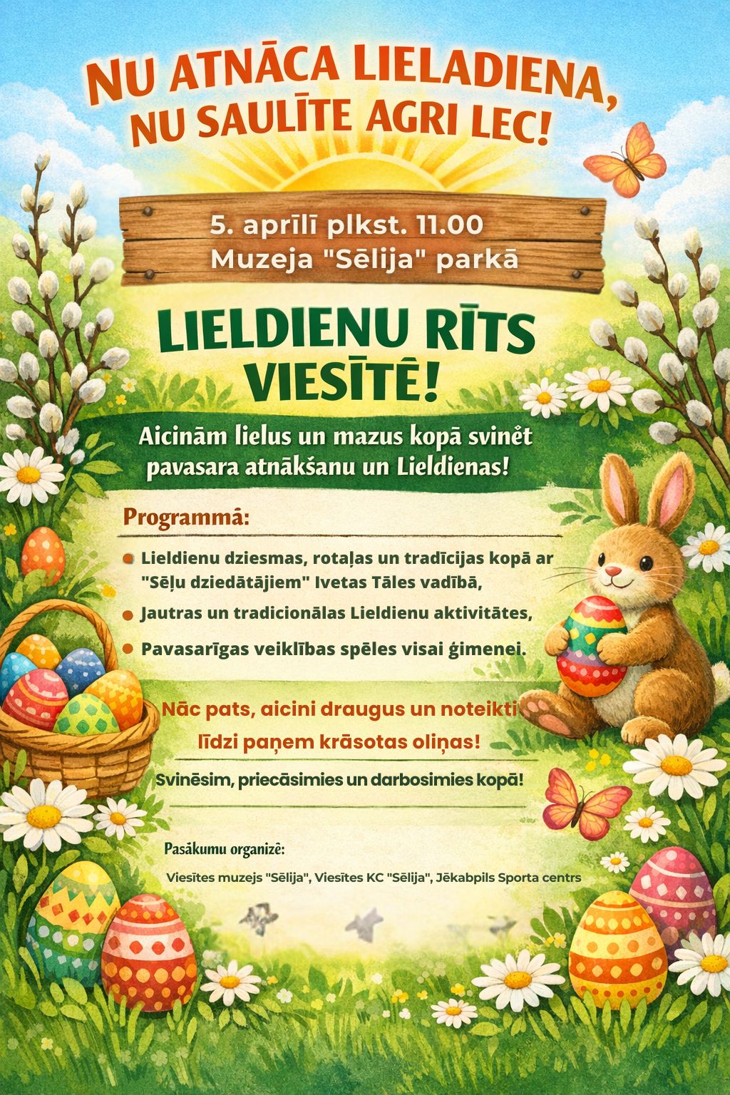 Programmā: Lieldienu dziesmas, rotaļas un tradīcijas kopā ar “Sēļu dziedātājiem” Ivetas Tāles vadībā, Jautras un tradicionālās Lieldienu aktivitātes, Pavasarīgas veiklības spēles visai ģimenei. Nāc pats, aicini draugus un noteikti līdzi paņem krāsotas oliņas! Svinēsim, priecāsimies un darbosimies kopā! Pasākumu organizē: Viesītes muzejs “Sēlija”, Viesītes KC “Sēlija”, Jēkabpils Sporta centrs.
