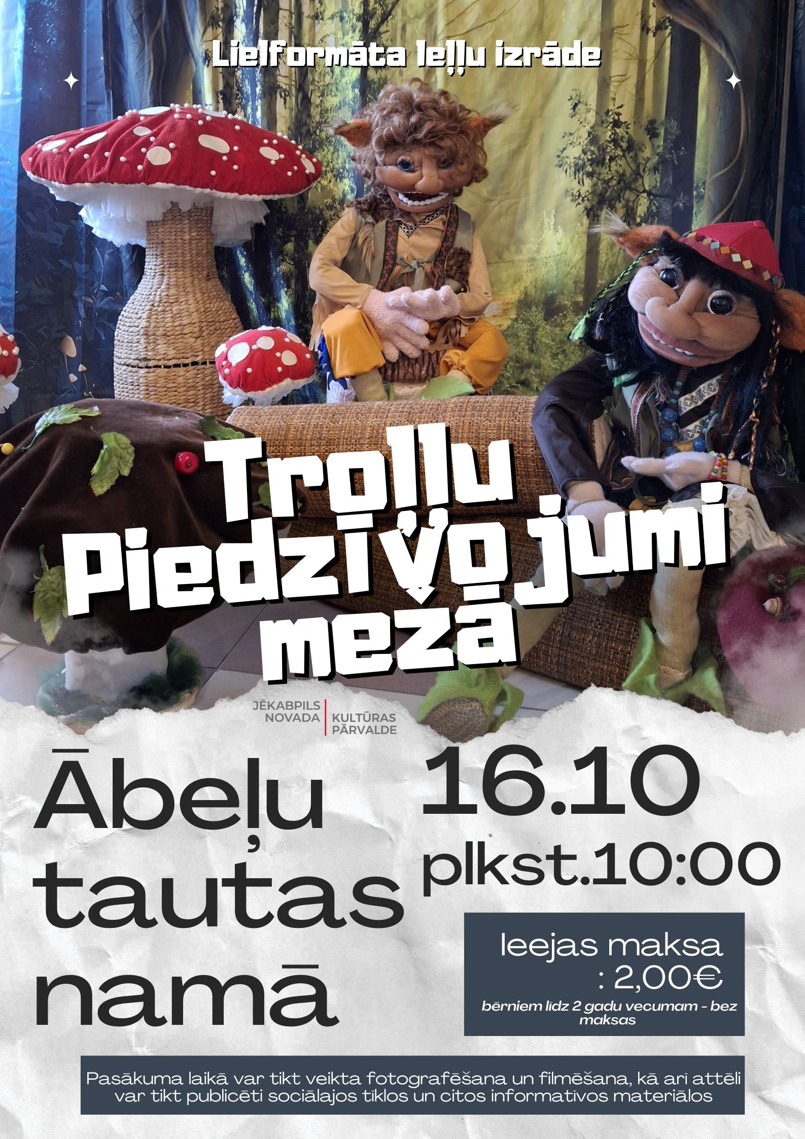 16.10. plkst. 10.00 Ābeļu Tautas namā notiks lielformāta leļļu izrāde “Troļļi”.