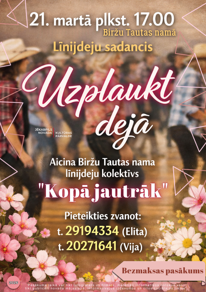 21. martā plkst.17.00 Biržu Tautas namā Līnijdeju sadancis “Uzplaukt dejā”