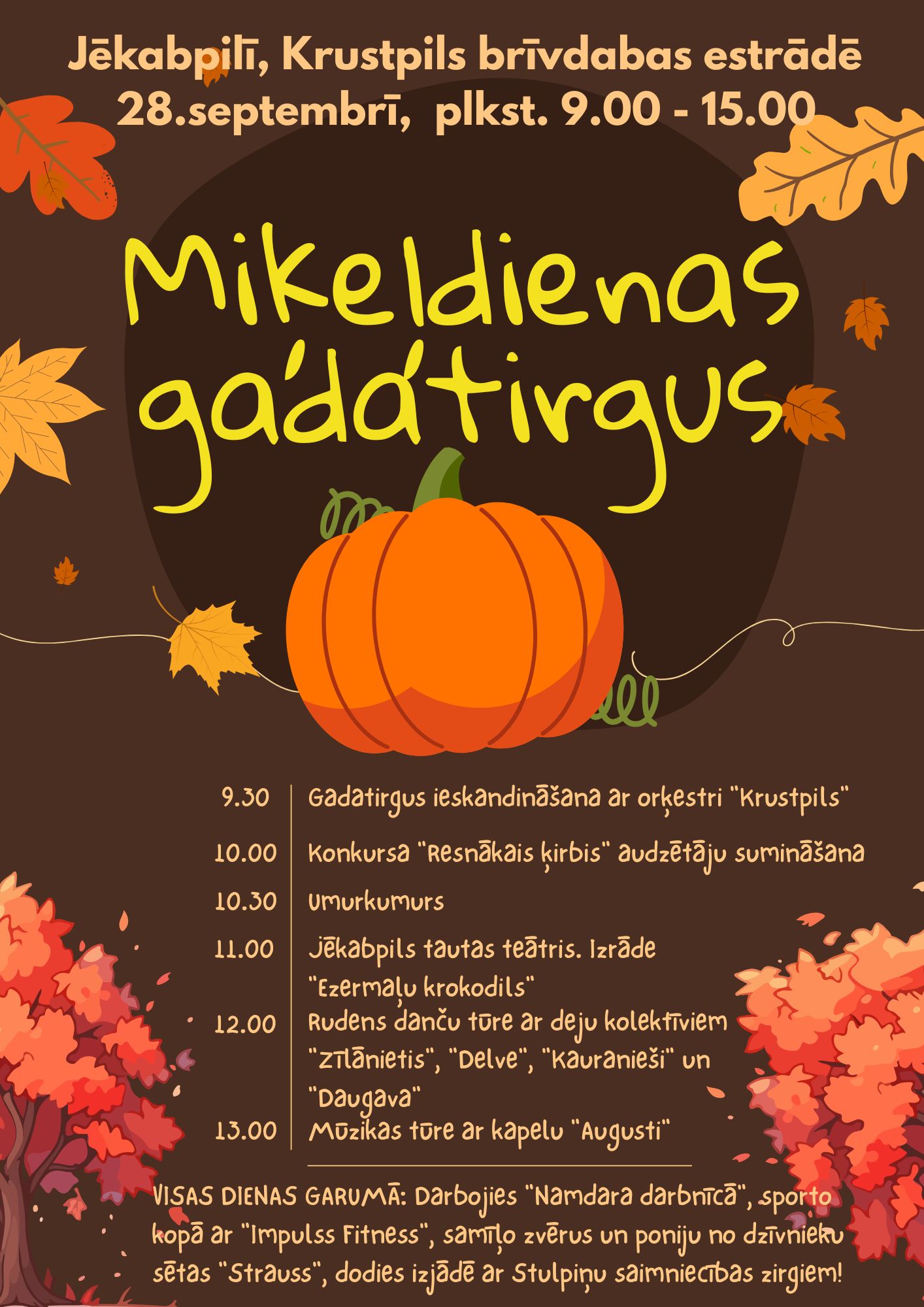 Par tradīciju kļuvusi Miķeļdienas gadatirgus ieskandināšana ar orķestra “Krustpils” skaņām, pēc lustīgas orķestra mūzikas un pilsētnieku pamodināšanas, svētkus turpināsim ar neatņemamo tradīciju – “Resnākā ķirbja” īpašnieku sumināšanu un noskaidrosim veiklākos Umurkumurā kāpējus.
