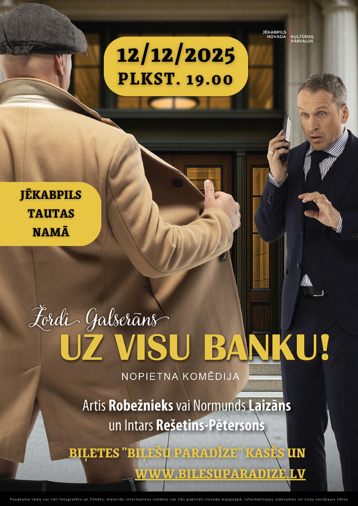 12.12. plkst.19.00 Jēkabpils Tautas namā nopietna komēdija “Uz visu banku!”.