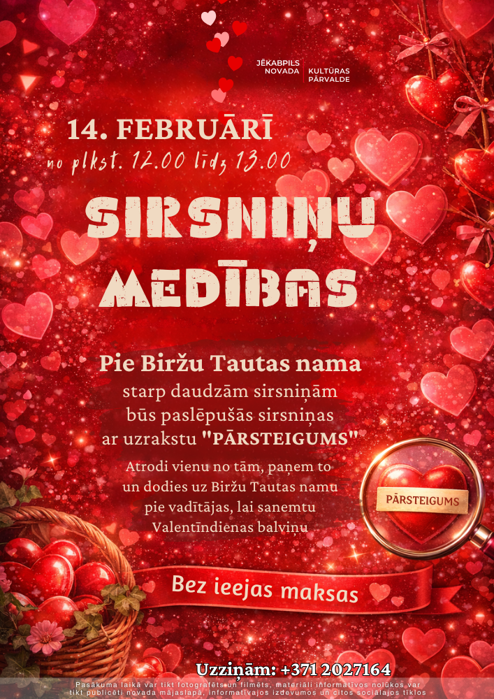 Pie Biržu Tautas nama starp daudzām sirsniņām paslēpušās sirsniņas ar uzrakstu – pārsteigums, atrodi vienu no tām, paņem un dodies uz Biržu Tautas namu pie vadītājas, lai saņemtu Valentīndienas balviņu!