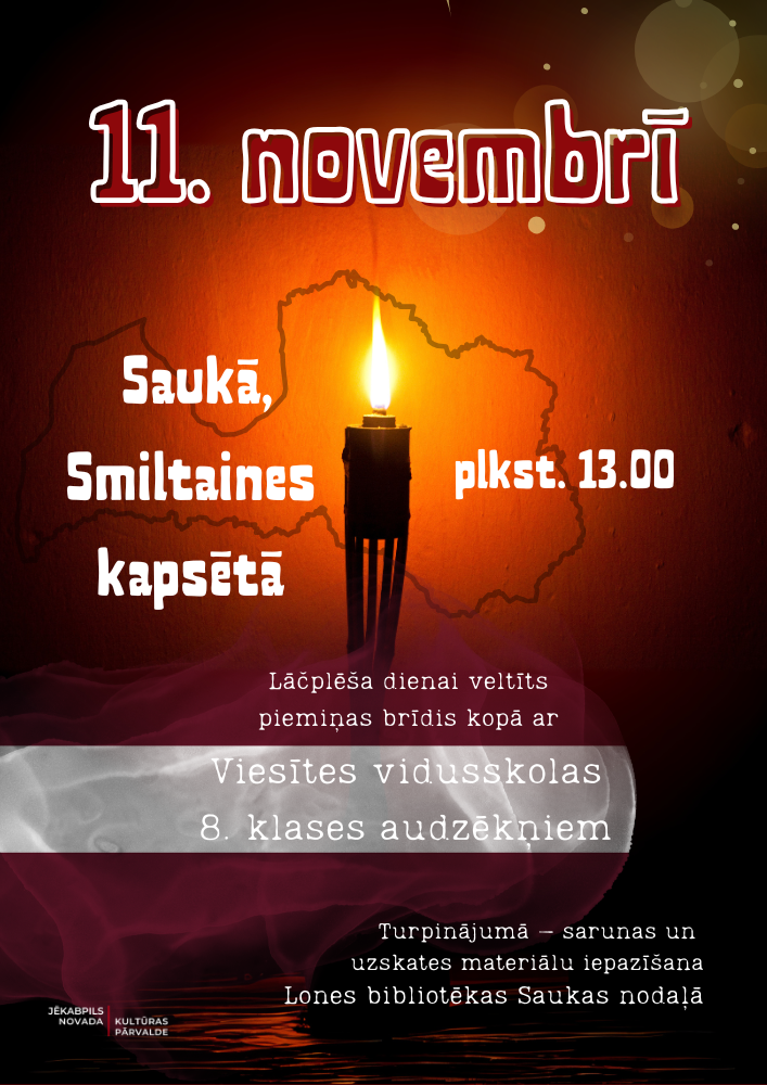 11. novembrī plkst. 13.00 piemiņas brīdis Smiltaines kapsētā, veltīts Lāčplēša dienai.