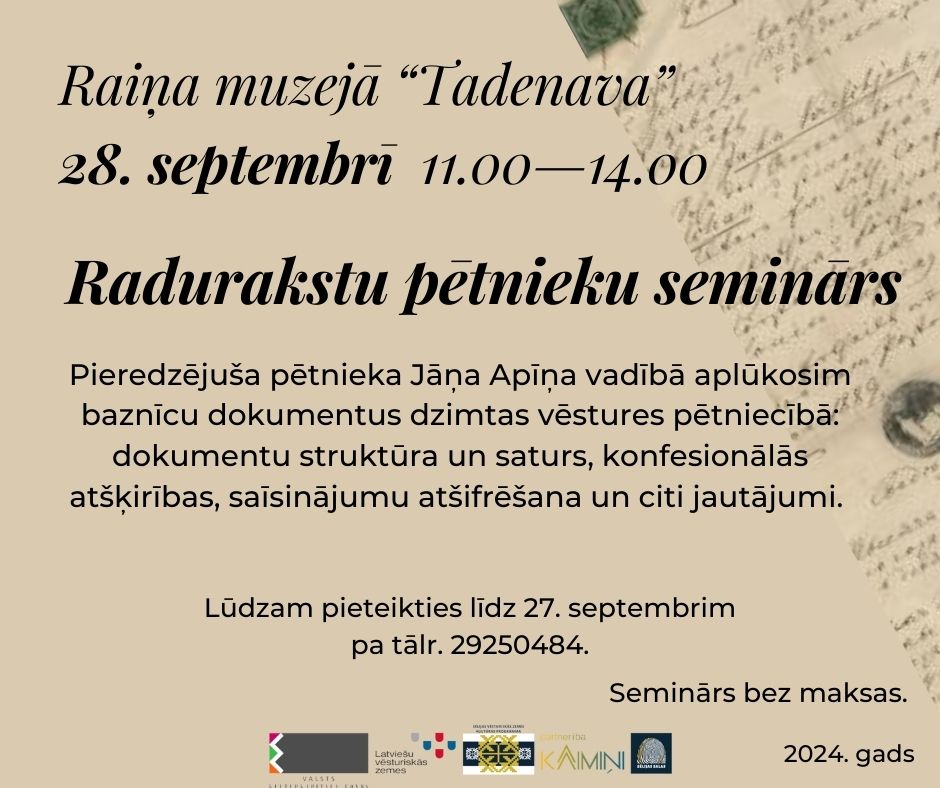 28. septembrī plkst.11:00 Raiņa muzejā “Tadenava” norisināsies radurakstu pētnieku seminārs. Pētnieka un lektora Jāņa Apīņa vadībā aplūkosim baznīcu radīto avotu izmantošanu dzimtas pētniecībā, apgūsim, kā pareizi lasīt baznīcu grāmatas un saprast tajās sniegto informāciju (struktūra, saīsinājumi, termini).