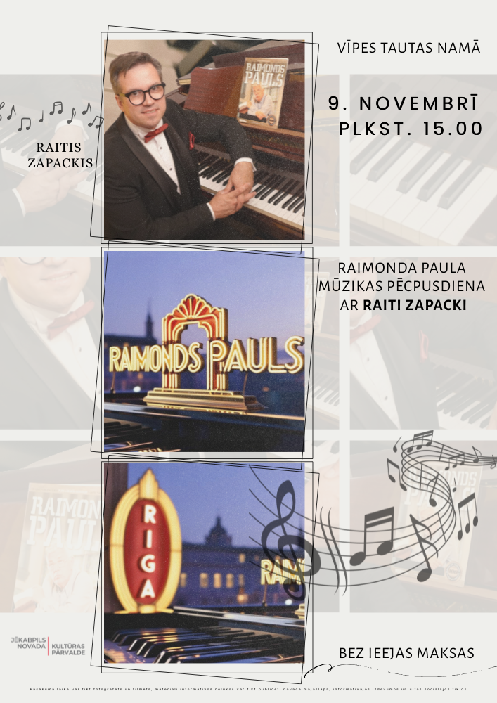 09. 11. plkst. 15.00 Vīpes Tautas namā notiks Raita Zapacka koncerts “Raimonda Paula mūzika”.