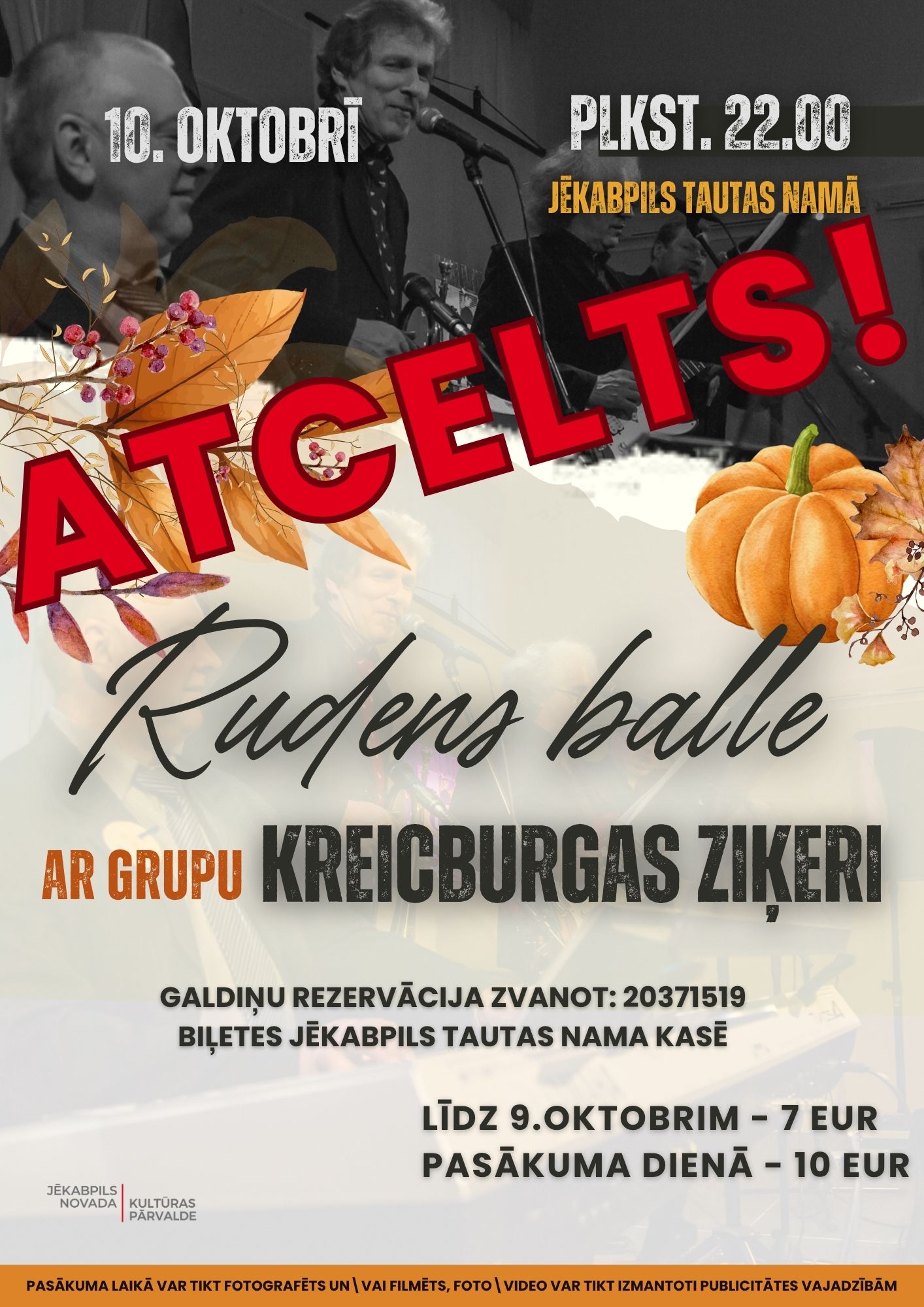 10. oktobrī plkst. 22.00 Jēkabpils Tautas namā plānotā balle ar grupu “Kreicburgas ziķeri” IR ATCELTA!!