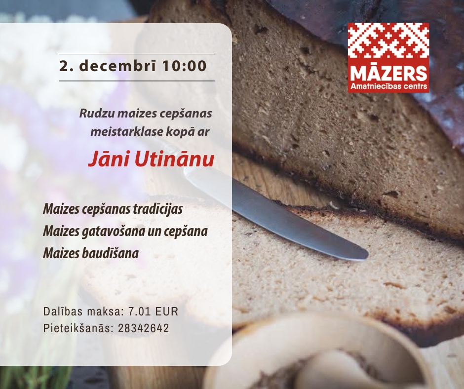 2. decembrī plkst. 10.00 amatniecības centrā “Māzers” Rudzu maizes cepšanas meistarklase ar Jāni Utinānu.