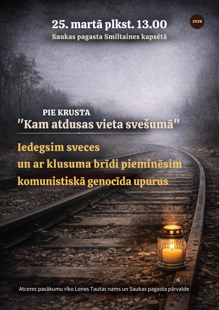 25. martā plkst.13.00 Komunistiskā genocīda upuru piemiņas diena Saukas pagasta Smiltaines kapsētā pie krusta “Kam atdusas vieta svešumā!”