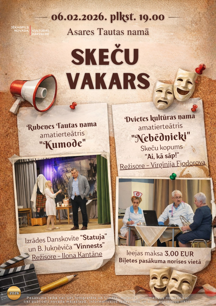 06. februārī plkst.19.00 Asares Tautas namā skeču vakars.