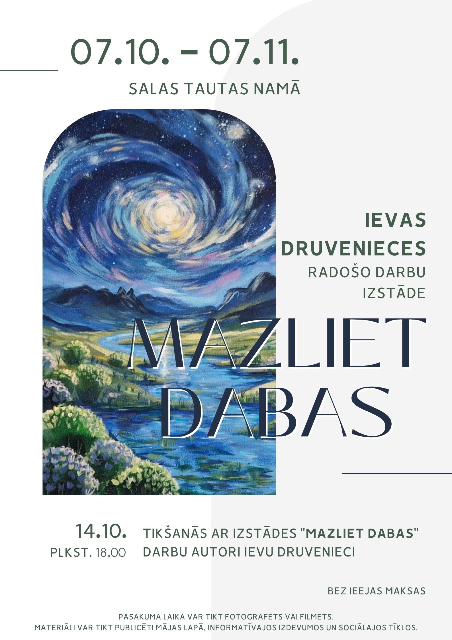 No 7. oktobra līdz 7. novembrim Salas Tautas nama Mazajā zālē skatāma izstāde “Mazliet dabas”, savukārt 14. oktobrī plkst. 18.00 notiks tikšanās ar izstādes radošo darbu autori Ievu Druvenieci.